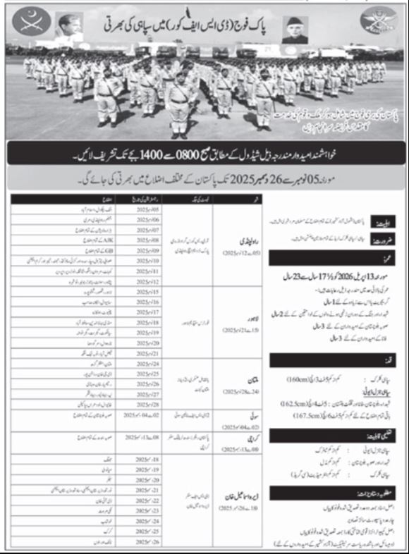 Applicants must have a Middle or Matric qualification from a recognized institution. Candidates should possess good discipline, physical fitness, and a willingness to perform duties as assigned by the Pakistan Army. Relevant experience may be an advantage but is not mandatory for all roles.